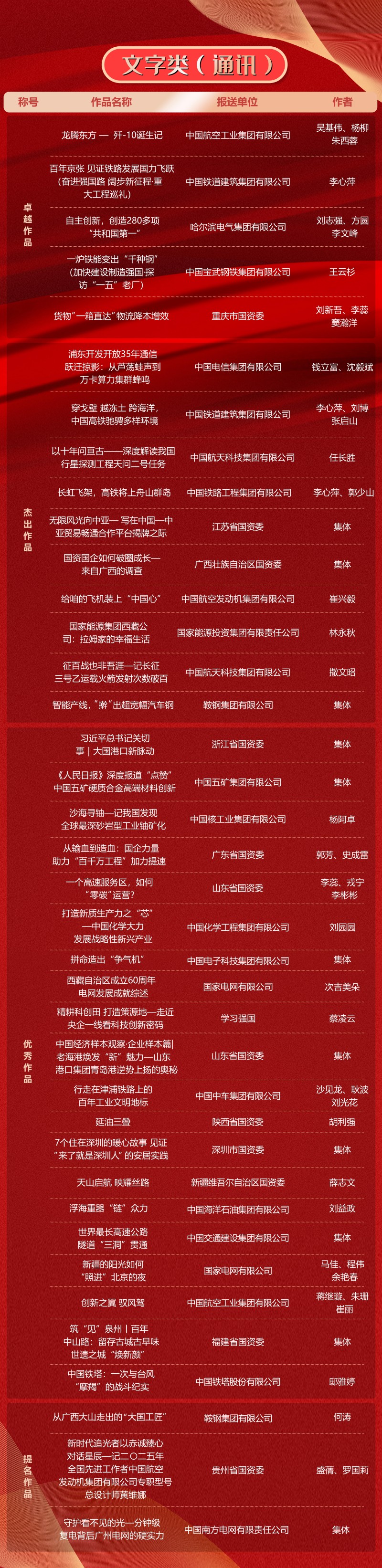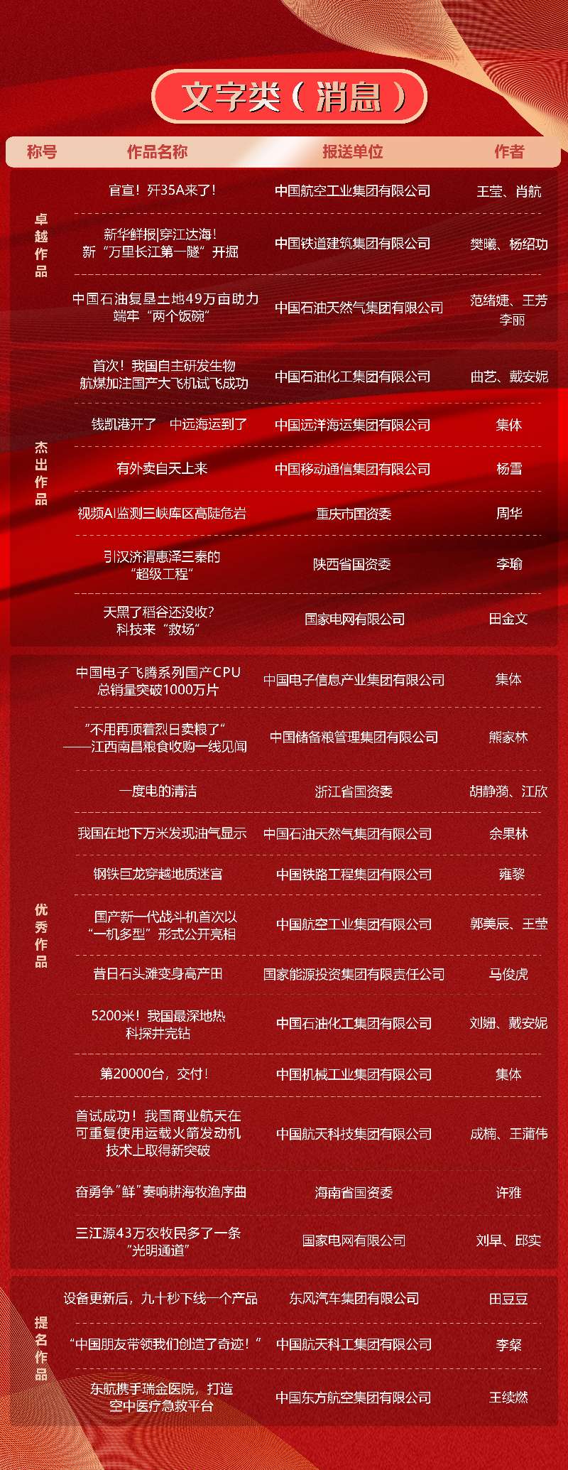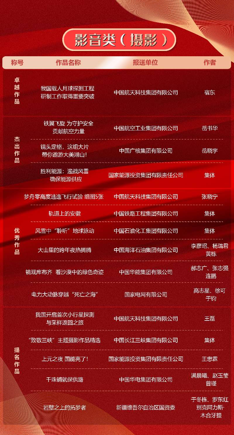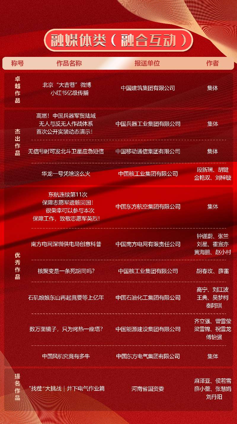 第十一届“国企好新闻”推介作品于11月21日揭晓。本次“国企好新闻”由国务院国资委宣传局、中国记协国内部指导,国务院国资委新闻中心主办,《国资报告》杂志社承办。经初审、复审、终审、公示,共有文字、融媒体、影音、国际传播、人工智能(AI辅助作品)5类255件作品榜上有名。