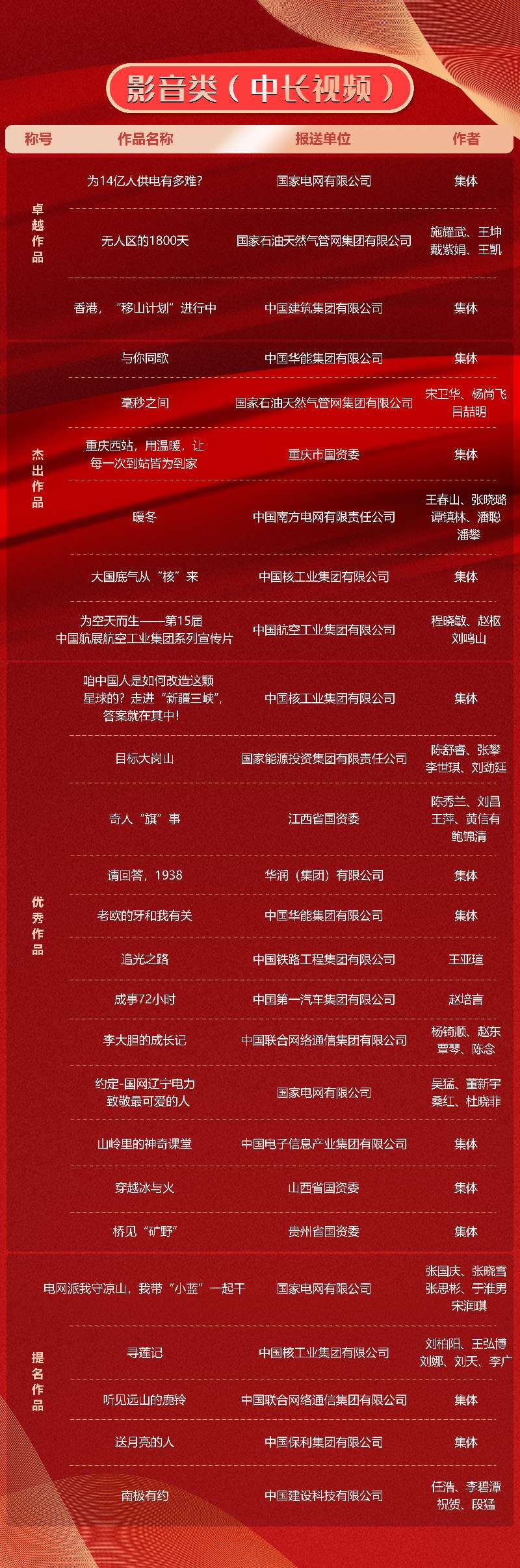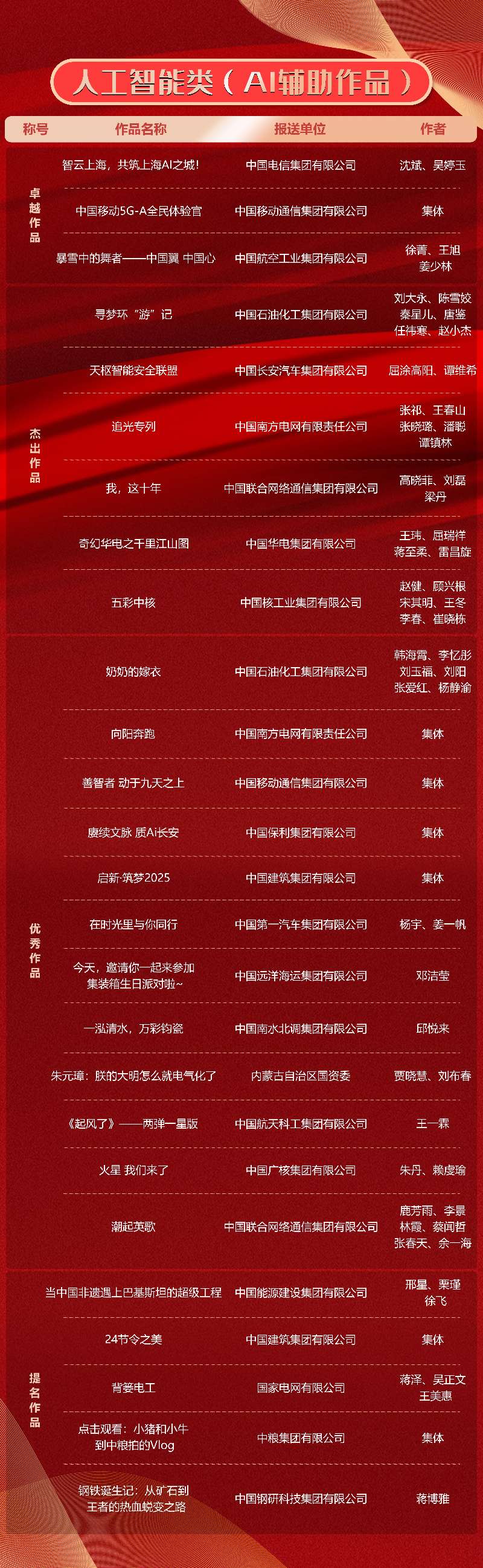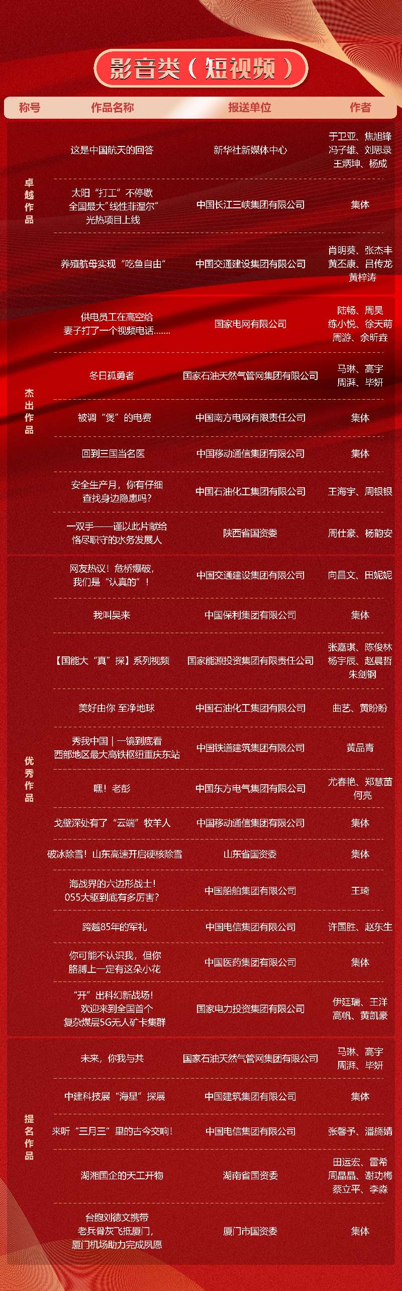 第十一届“国企好新闻”推介作品于11月21日揭晓。本次“国企好新闻”由国务院国资委宣传局、中国记协国内部指导,国务院国资委新闻中心主办,《国资报告》杂志社承办。经初审、复审、终审、公示,共有文字、融媒体、影音、国际传播、人工智能(AI辅助作品)5类255件作品榜上有名。